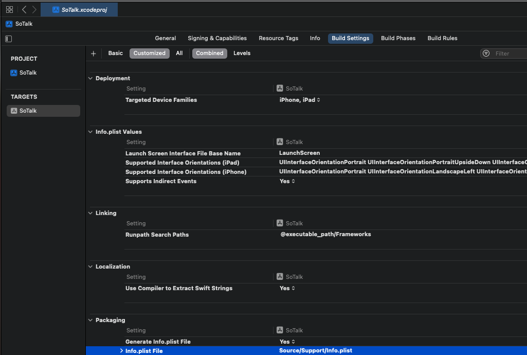 Info.plist 위치 또한 변경됩니다. 이 또한 xcodeproj -> target -> BuildSettings에서 변경하면 됩니다.