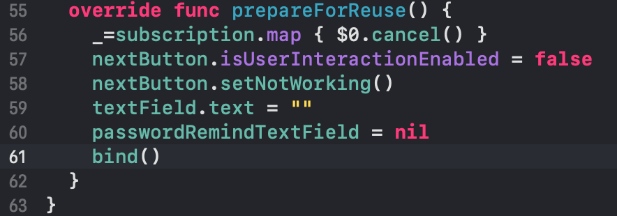 저의 경우 기존에 bind된 subscriber를 취소하고 재등록시켰습니다. 그리고 버튼의 상호작용 false + 상호작용안될 때의 컬러 등등... 으로 cell이 재사용 큐에서 꺼내지기 전에 초기화 해야할 것들을 초기화 해줬습니다.