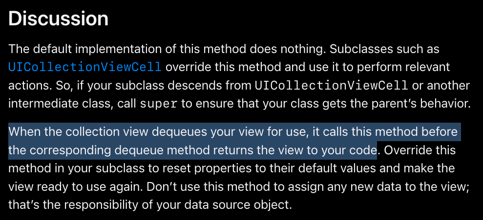 https://developer.apple.com/documentation/uikit/uicollectionreusableview/1620141-prepareforreuse/