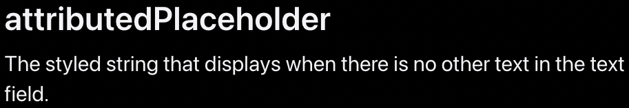 이럴 땐 attributedPlaceholder 속성을 사용하면 됩니다. 얘도 마찬가지로 텍스트필드에 text가 없을 때 attributed로 styled된 string이 텍스트 필드에 보여집니다. (= placeholder) 이를 사용하면 시스템에서 정의된 placeholder 색이 아닌 내가 원하는 방식으로 지정할 수 있습니다. (NSMutableAttributedString vs NSAttributedString 관련 포스트)