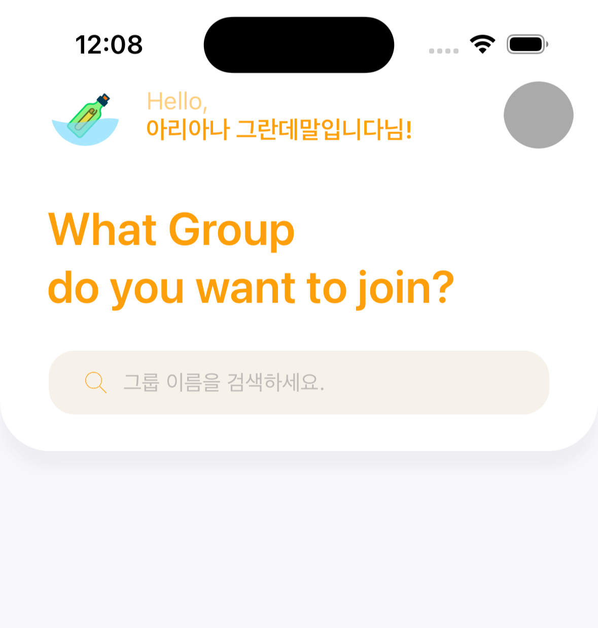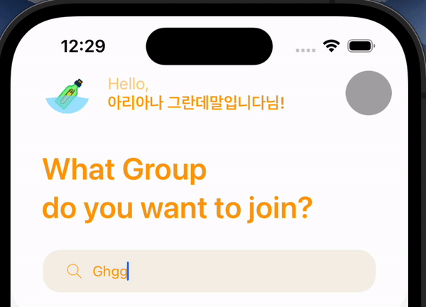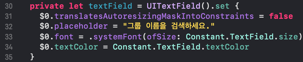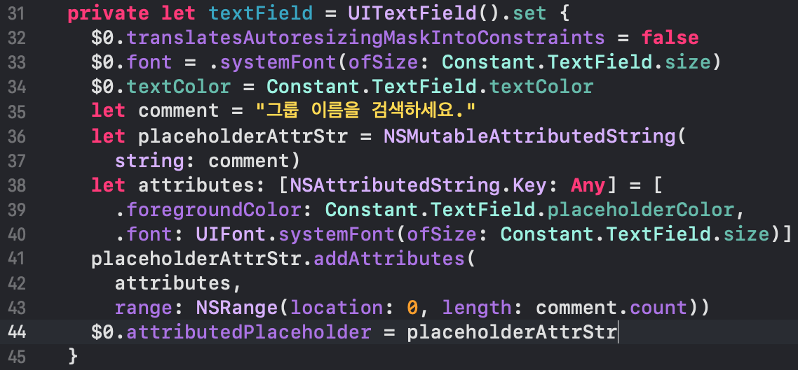 "그룹 이름을 검색하세요." 이 부분이 텍스트 필드인데 오랜지로 깔 맞춤하면 좋을 것 같아서 UITextField의 속성을 찾아봤는데 String타입의 placeholder의 color 변경하는 속성은 없었습니다.