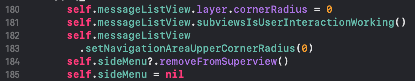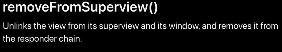 event 응답 체인, 윈도우와 자신의 superview로부터 Unlink가 됩니다. 참조중인 subview를 superview로부터 지우는 함수입니다. 뷰 계층에서 분리가 됩니다. ( superview로부터 지워졌기 때문입니다.) 하지만 superview의 subviews [UIView]에서만 제거가 된 것이기 때문에 여전히 viewController의 sideMenu 인스턴스는 남아져 있습니다. 그래서 185번 라인을 통해 완전히 인스턴스를 해제할 수 있습니다.