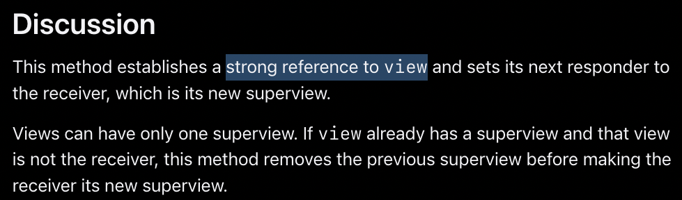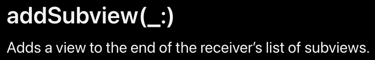 그래서 view의 함수인 addSubview(_:)를 살펴봤습니다. 진짜 많이 사용했는데,, 귀찮아서 나중엔 subview를 배열로 묶어 map으로 처리를 하긴 하고 있지만... 그럼에도 이 함수의 설명을 이제서야 공식문서에서 찾아 봤습니다.