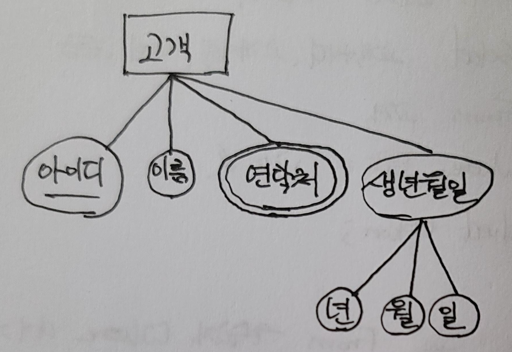 고객 Entity에 생년월일 속성을 추가한다면, 생년월일이란 (복합)속성은 년, 월, 일의 (단순)속성으로 세분화가 가능합니다.