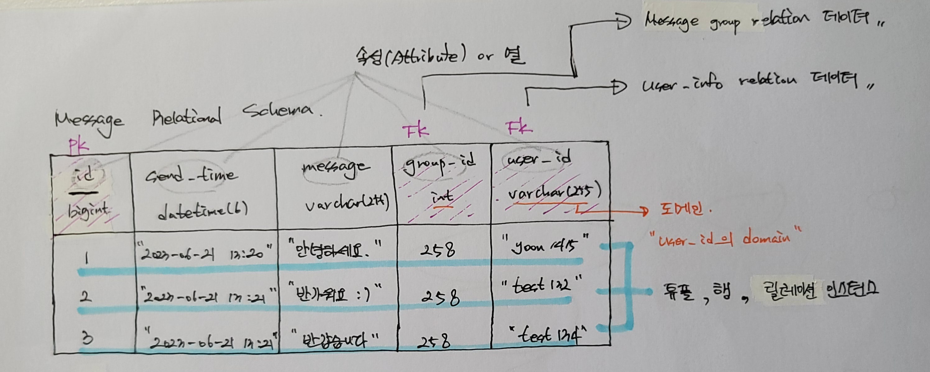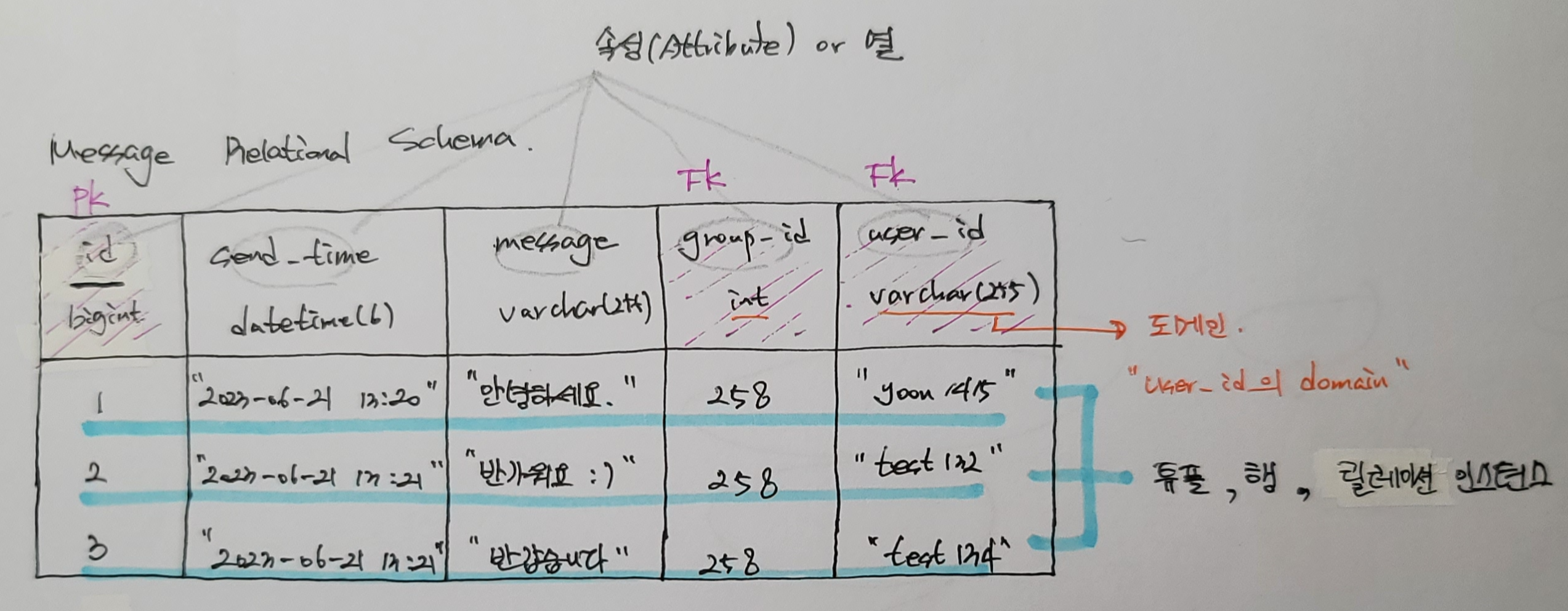 Relation에서 릴레이션 스키마 Message relation schema(id, send_time, message, group_id, user_id) 행을 제외한 아래의 행은 릴레이션 스키마의 cosntraint, domain 집합에 포함되는 각각의 데이터가 담깁니다. 각각의 행은 tuple, 행 또는 relation instance라 부릅니다.