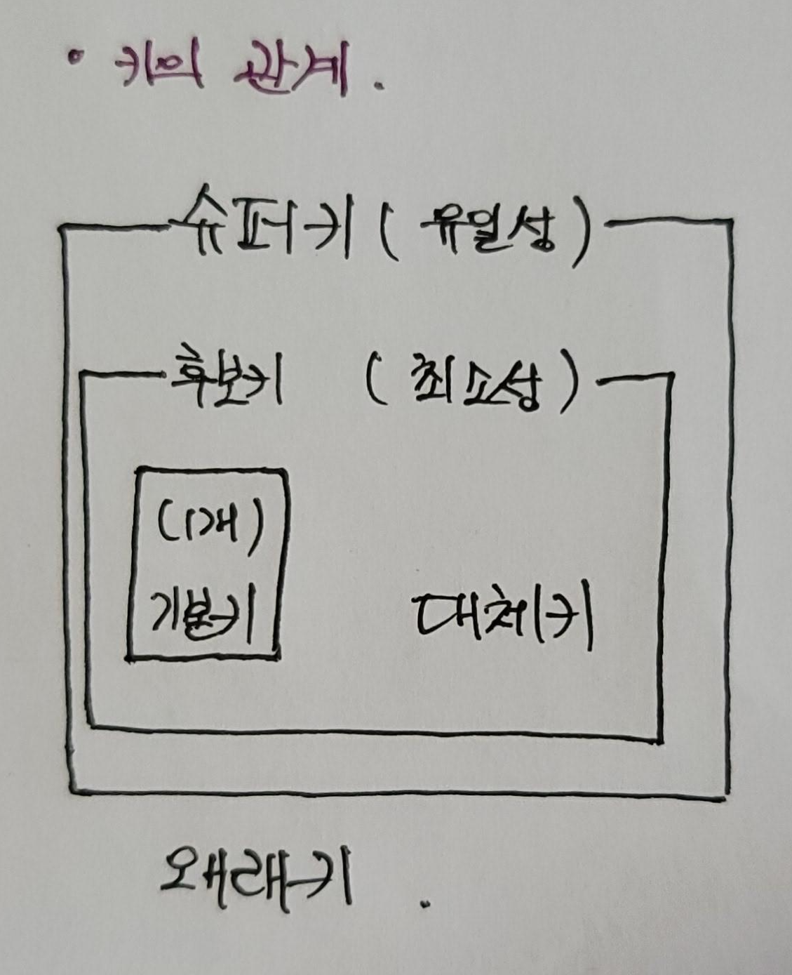 키의 관계에서 후보키는 기본키에 포함되어 있습니다. 추후 정규화에서 BCNF할 때 이 개념을 잘 기억하고 있어야 합니다.