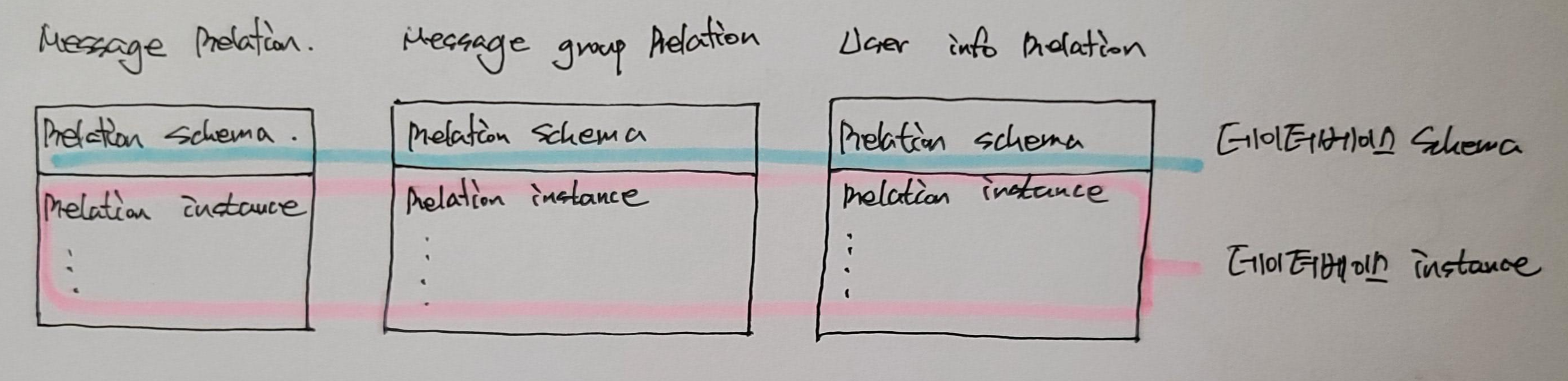 데이터베이스에서의 스키마는 message relation schema, message gruop relation schema, user info relation schema 등 데이터 베이스를 구성하는 릴레이션 스키마의 모임입니다. 즉 일반적인 데이터베이스는 여러개의 릴레이션으로 구성되어 있습니다. Database's instance는 데이터베이스에 들어있는 data set을 의미합니다.