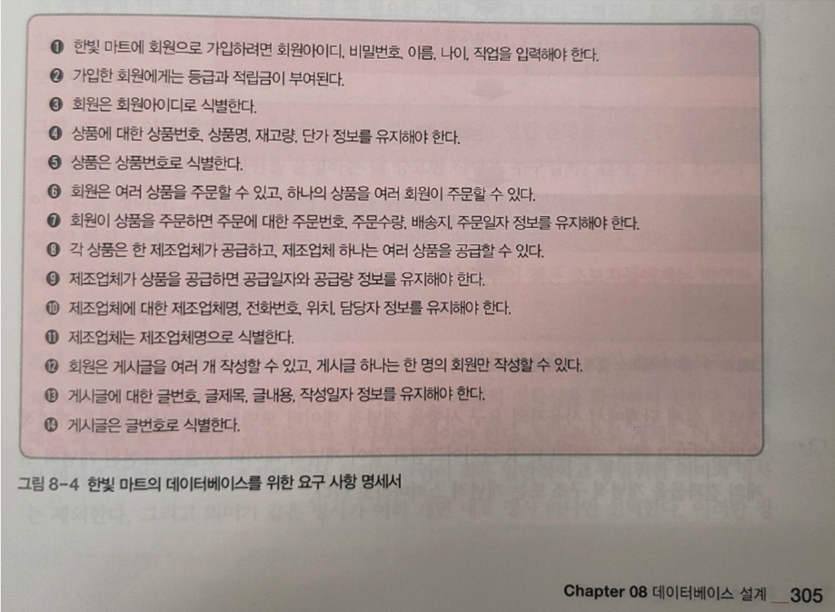 그 예로 인터넷으로 회원들에게 상품 판매하는 한빛마트를 위한 db를 만든다고 가정한다면