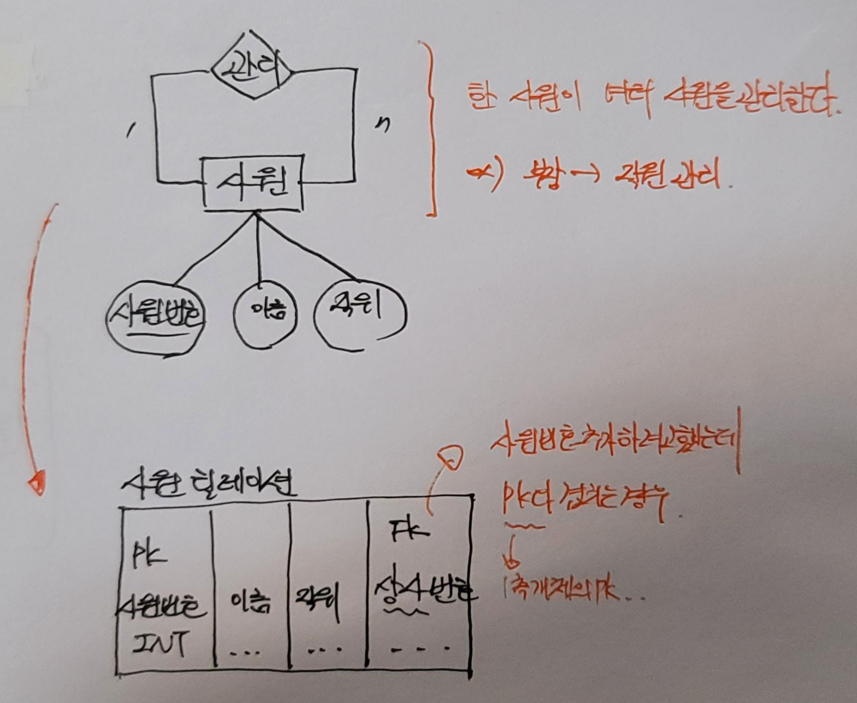 자기자신과 관계를 맺는 경우도 있다니,,, 순환 관계 또한 기본 규칙을 그대로 적용하지만 속성의 이름이 같을 경우 네이밍을 다르게 해서 1측 개체의 PK를 FK로 선언하면 됩니다.