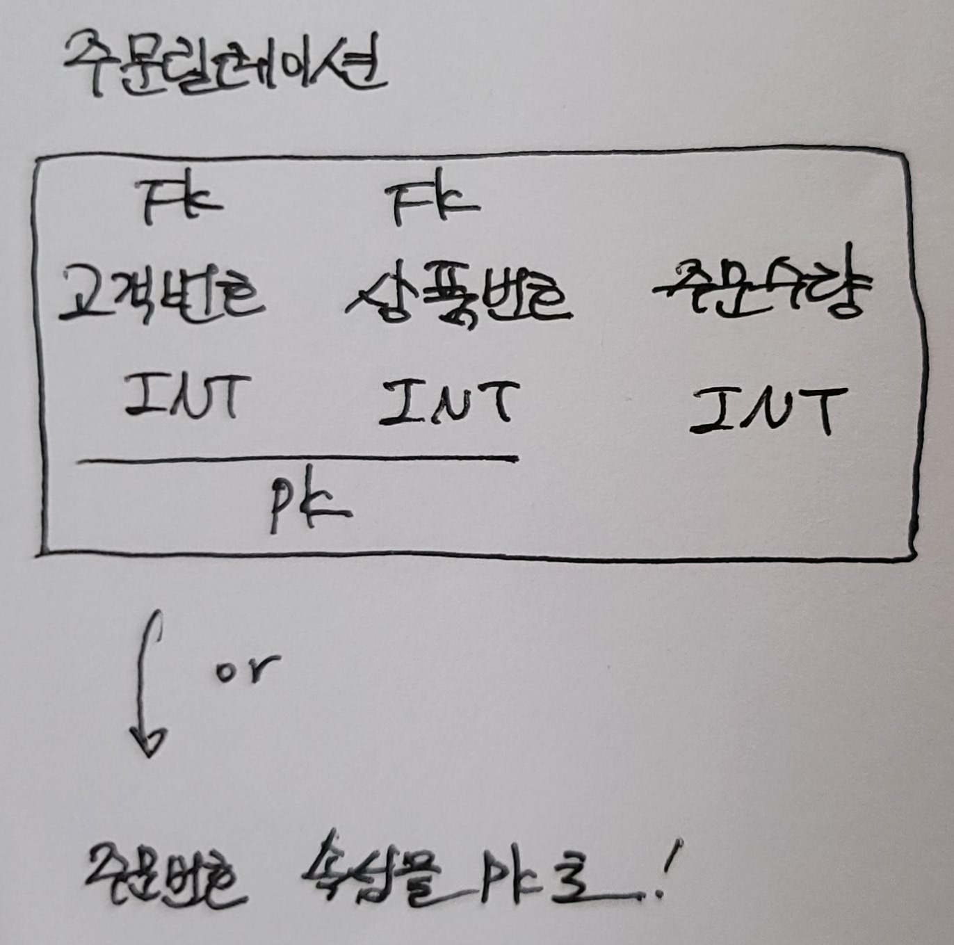 | 주문 | 회원(선택), 상품(선택) | 주문번호, 주문수량, 배송지, 주문일자 | n:m(다대다) |
