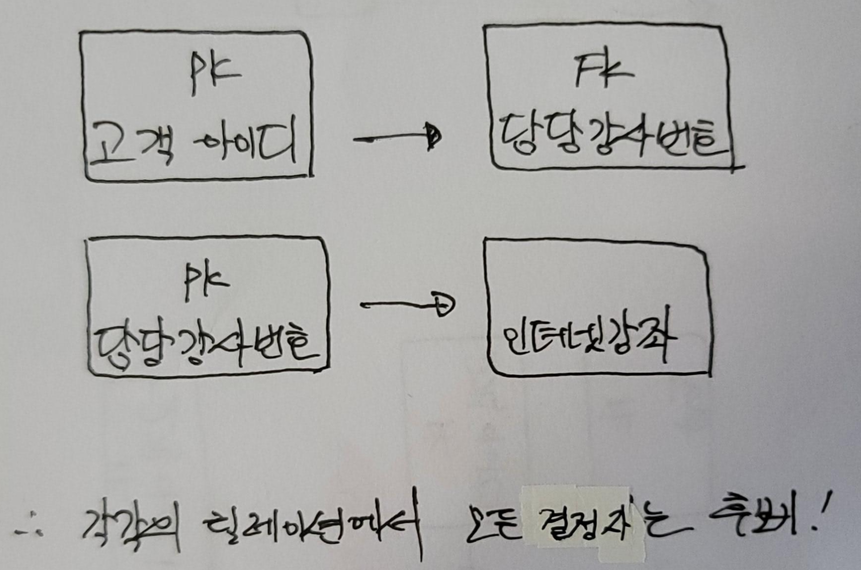 다시 돌아와서. 위 사진에서 결정자는 {고객아이디, 인터넷강좌}, {담당 강사번호} 두 개입니다. 담당 강사 번호를 안다고 고객 아이디를 알 수 없습니다. 즉, 담당 강사 번호는 후보키(유일성, 최소성)의 자격이 충분하지 않습니다. 후보키는 위에서 설명했지만 모든 튜플 데이터를 식별할 수 있어야 하기 때문입니다.