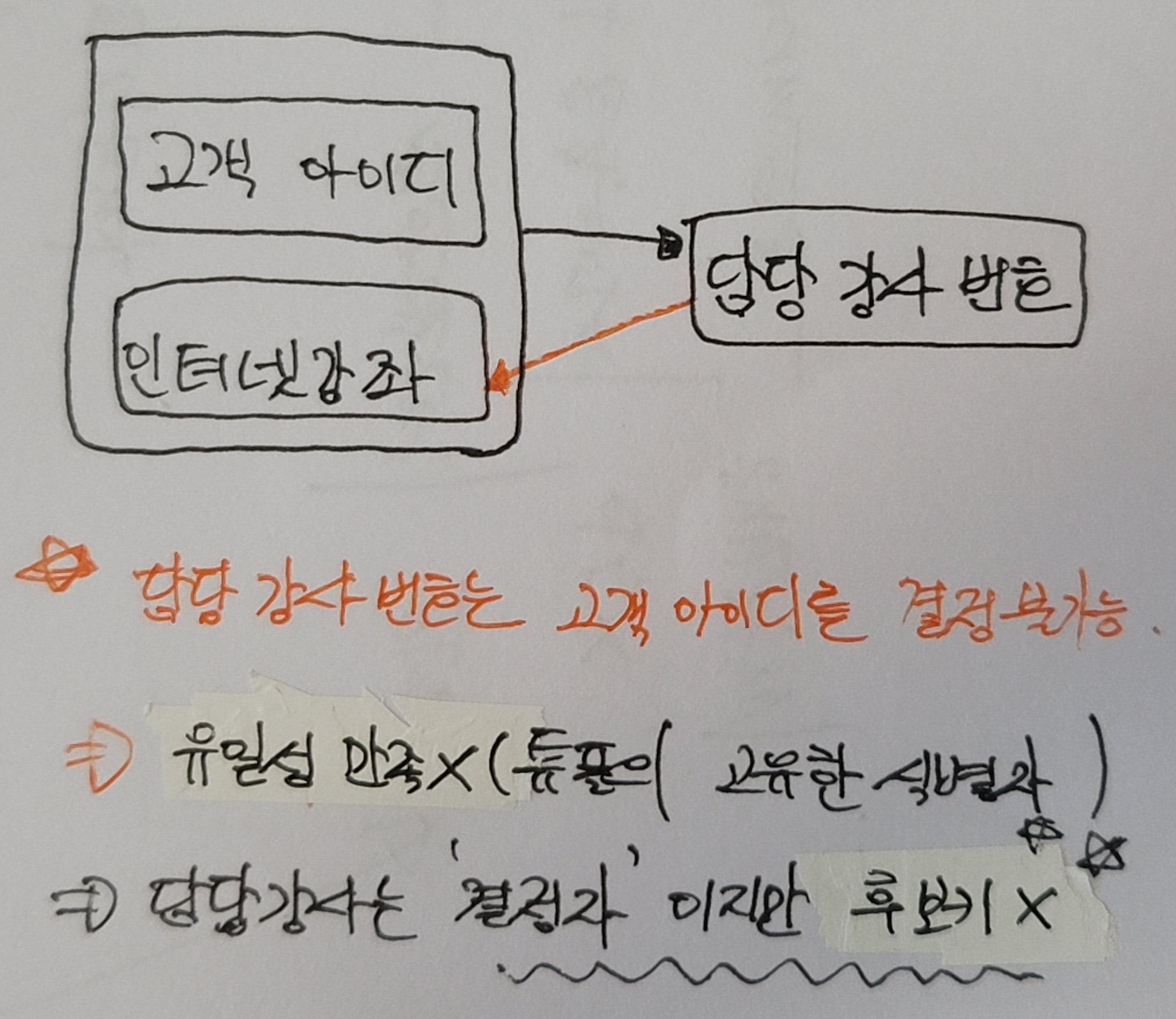 다시 돌아와서. 위 사진에서 결정자는 {고객아이디, 인터넷강좌}, {담당 강사번호} 두 개입니다. 담당 강사 번호를 안다고 고객 아이디를 알 수 없습니다. 즉, 담당 강사 번호는 후보키(유일성, 최소성)의 자격이 충분하지 않습니다. 후보키는 위에서 설명했지만 모든 튜플 데이터를 식별할 수 있어야 하기 때문입니다.