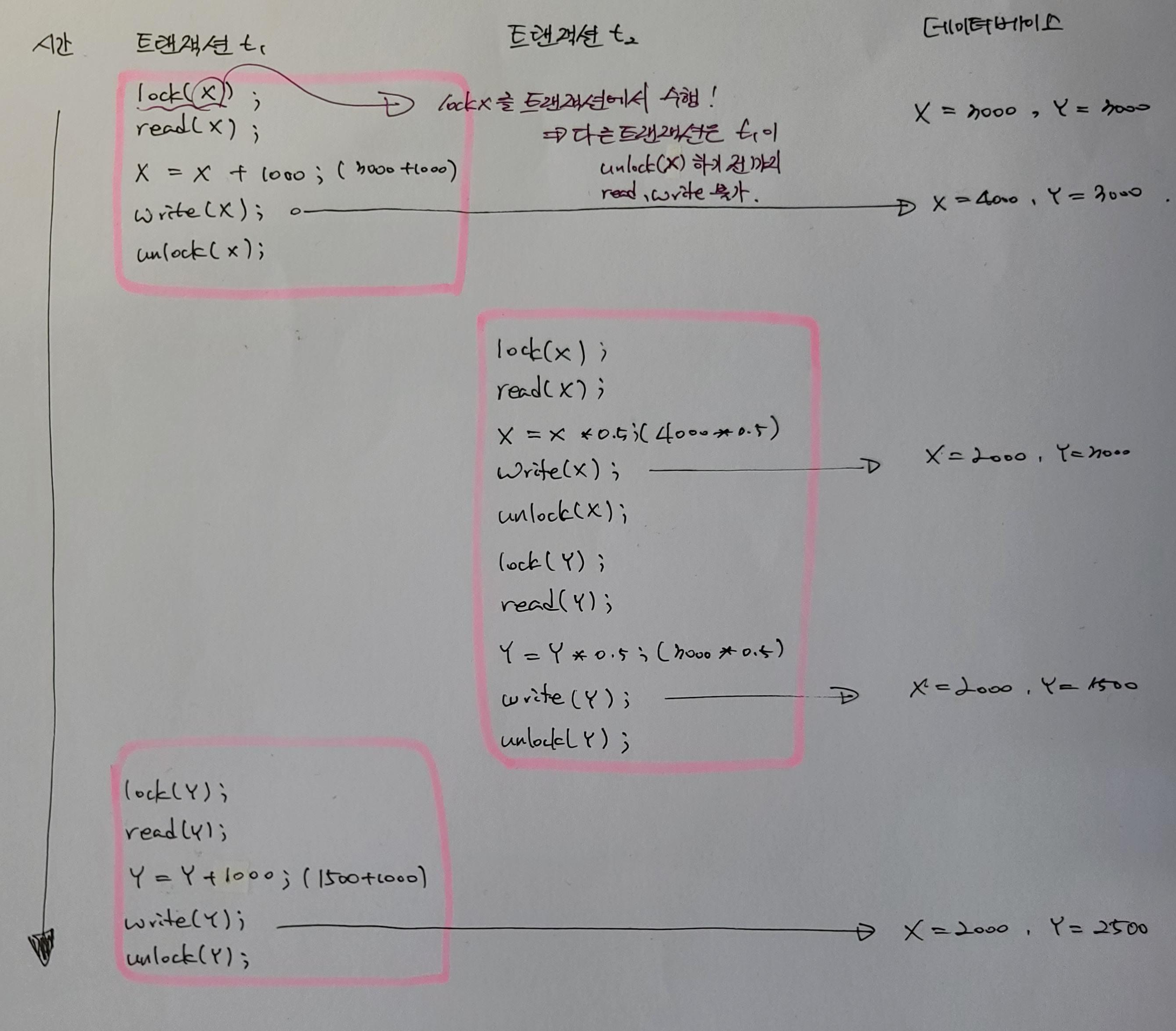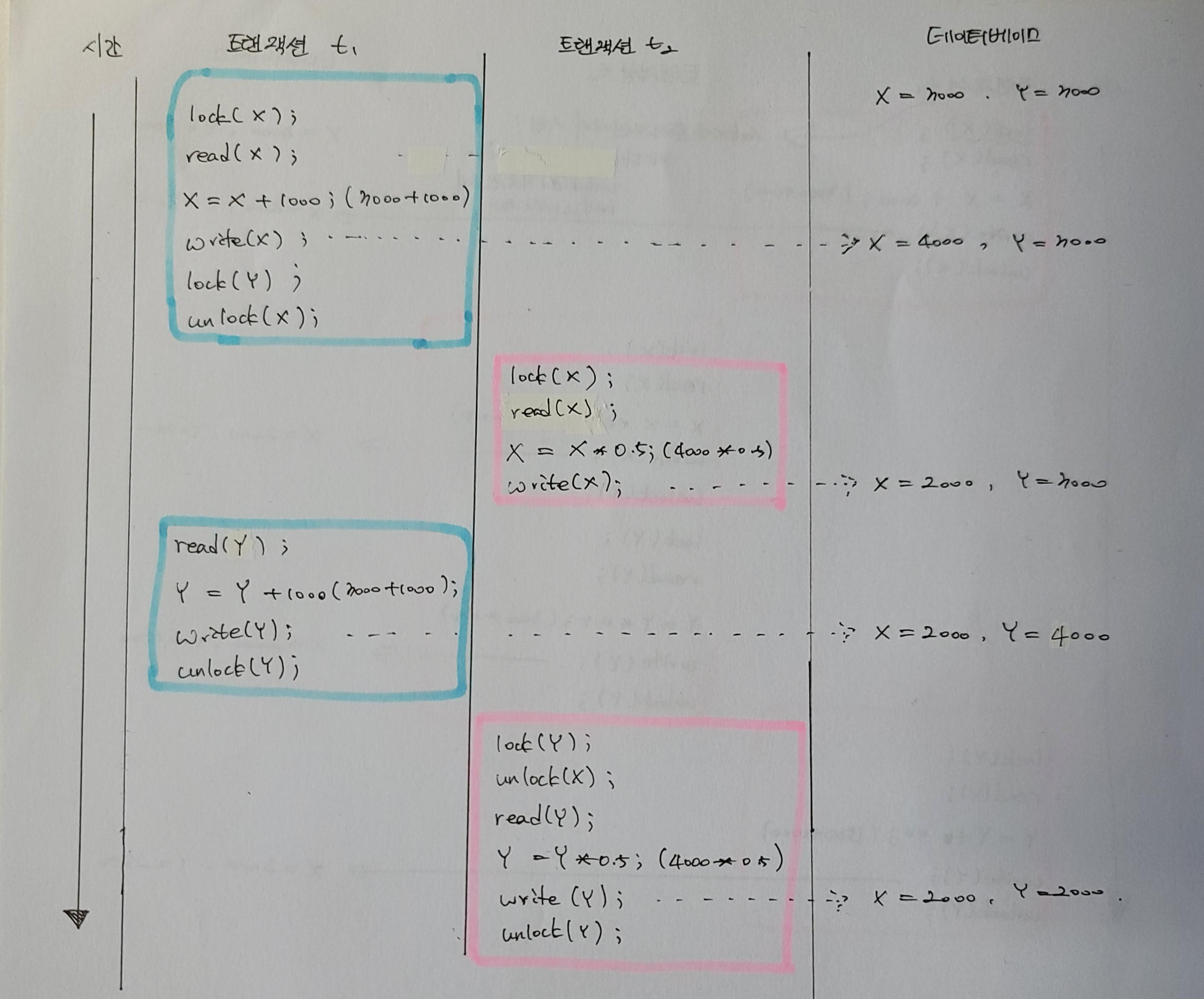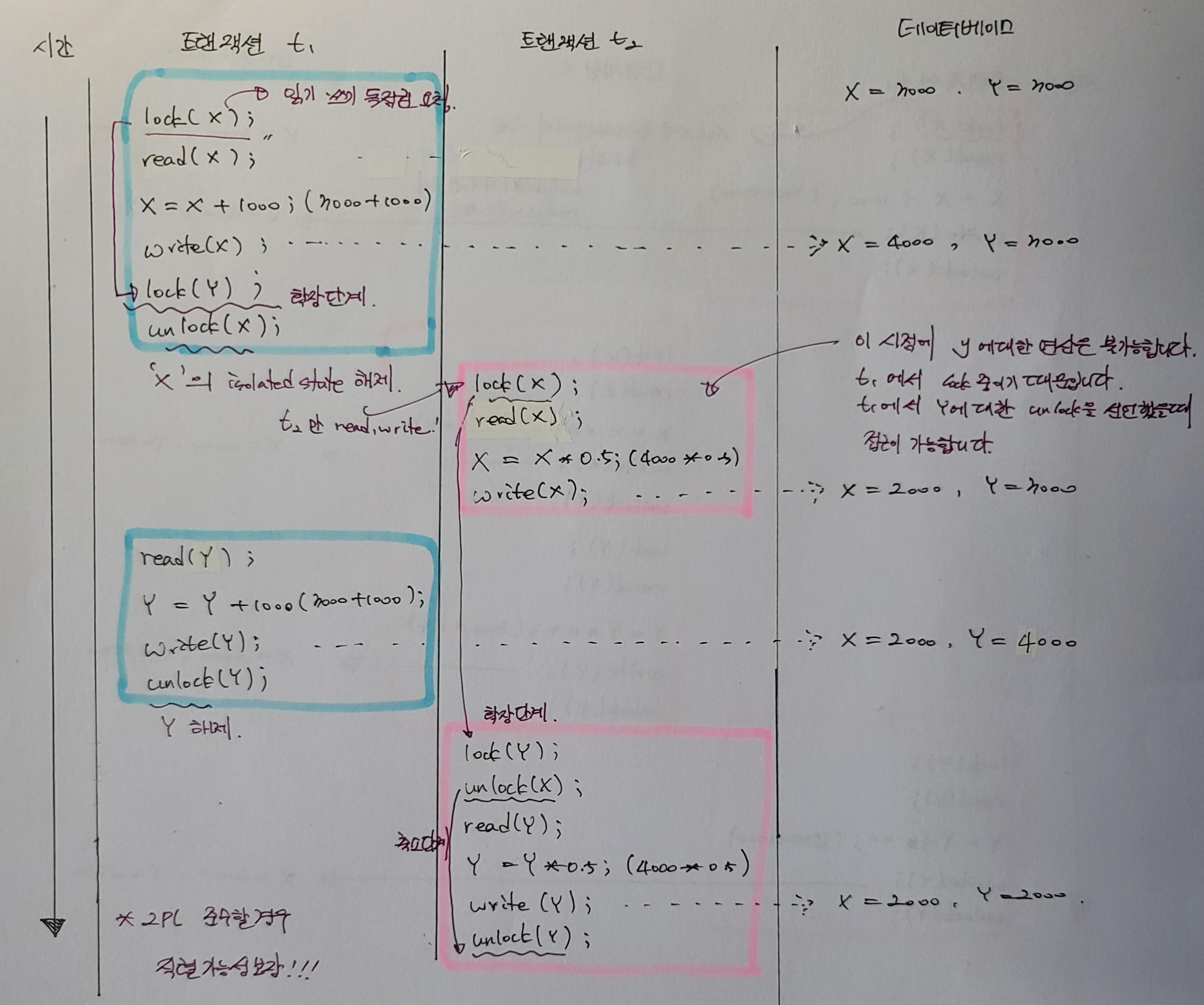 지금 문제는 트랜잭션 t1에서 X는 수행됬지만 아직 Y는 수행이 되지 않았습니다. 위 그림에서는 순수하게 특정 데이터를 읽기 전에 lock을 했지만 이렇게 lock을 활용할 경우 동시성 문제의 완벽한 제어는 보장되지 않습니다. 이 문제를 해결하기 위해 2단계 로킹 기법을 적용해야 합니다.