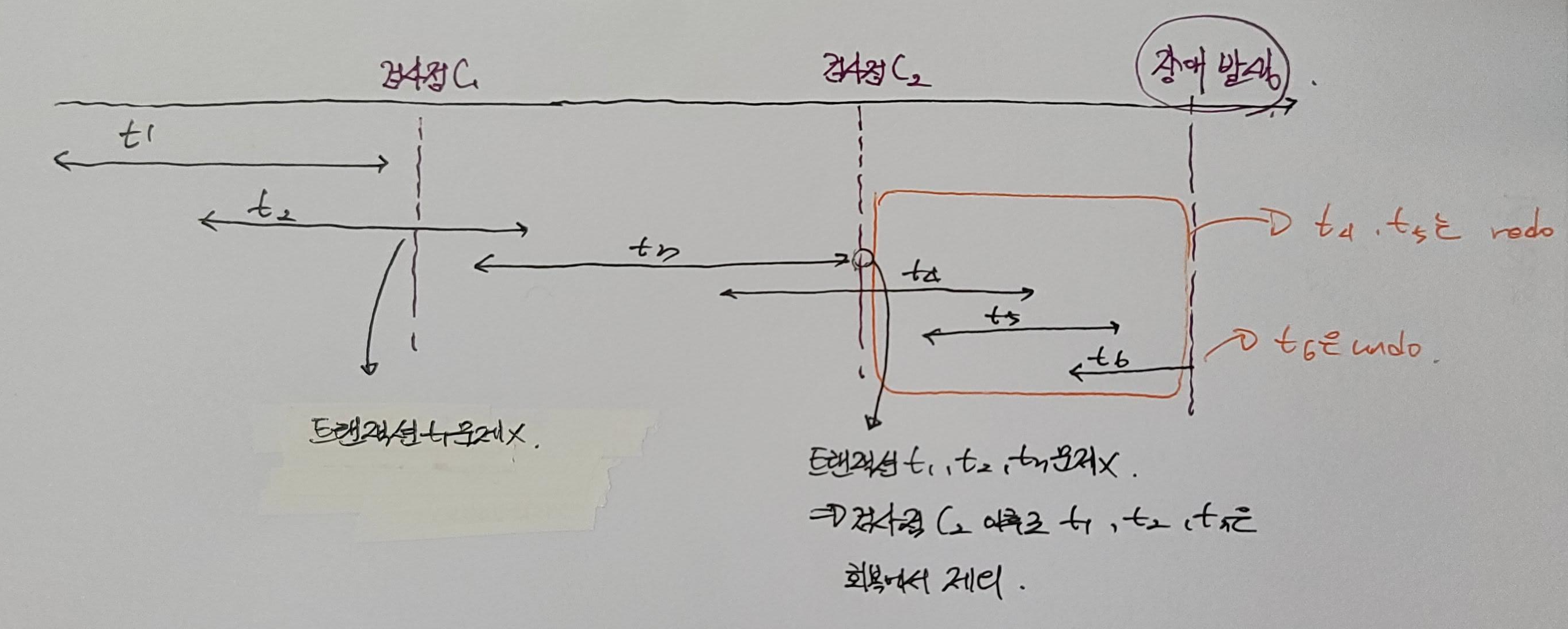장애 발생 시점 시 C2 이후 시점이기에 t1, t2, t3은 회복 연산을 하지 않고 장애 발생 전에 완료된 트랜잭션 중 검사점 대상이 아니었던 트랜잭션에 한해서 redo을 실행합니다. 만약 장애 발생시점에 실행중인 트랜잭션이 있다면 해당 트랜잭션은 undo 연산을 수행해야 합니다.