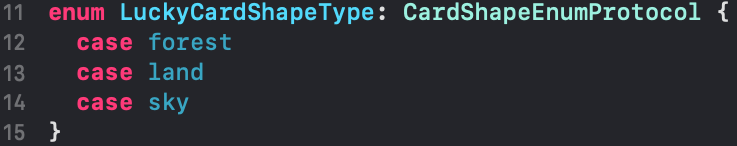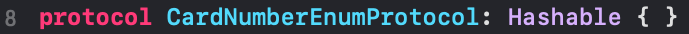 이것도 많이 부족하긴한데.. 원래는 서로 다른 enum 타입만 구체화 할 수 있도록 표현해야 했는데.. 프로토콜을 통해 이를 채택하는 것과 단순네이밍으로 구별했습니다.. enum에 대해 좀 더 공부를 해봐야겠습니다. 그래도 일단은 이 프로토콜을 상속받은 타입만 Card의 제너릭 타입으로 올 수 있습니다.