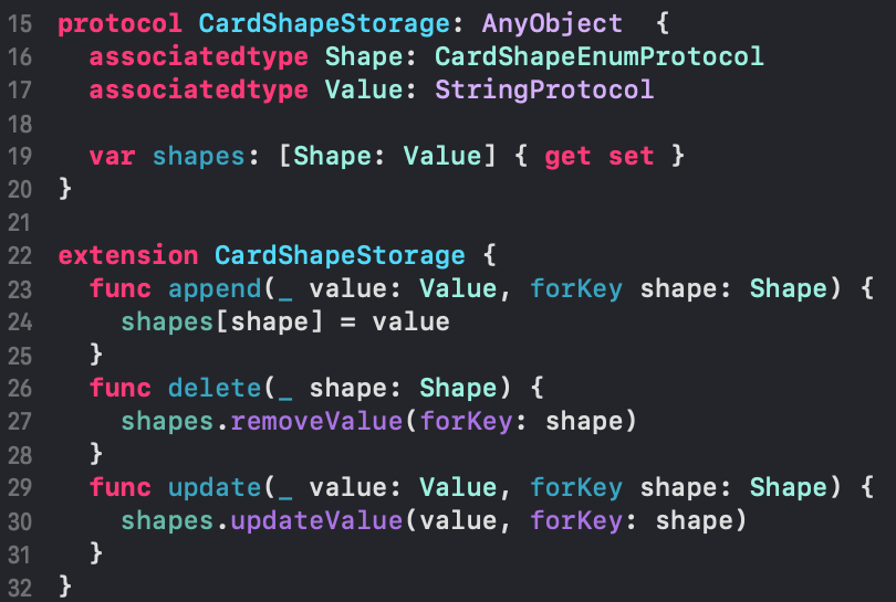 기본적으로 앞면, 뒷면, 모양, 카드 숫자가 있습니다. 이때 shape는 CardShapeEnumProtocol을 채택한 객체만 올 수 있습니다... 이렇게 카드 객체를 만들었는데요.