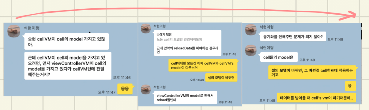 많은 내용이 오갔고 생략됬는데 MVVM 패턴에 대한 제 생각은 cell's vm에서 cell's model에 대한 처리를 해주면 좋겠다는 생각이었습니다(서버의 데이터 처리 등 + 갱신된 모델 또한 cell's vm에서 업데이트하고 cell한테 이벤트 보내고 등등..) 저는 Cell의 viewModel은 cell안에서 "cellForRowAt호출 시점에 반드시+_+ 만들어진다" 생각했고, clean architecture with mvvm을 공부중인 석현이형은 해당 example에 vm은 mainVM에서 CellVM들을 전부 생성한 예시를 기준으로 cell의 뷰모델 생성 시점을 생각하고 있었습니다. "mainVM이 모델도 갖고 있겠다 +_+ cellVM도 만들어 관리해볼까? - 클린아키텍쳐 중 mainVM에서 cellVM까지 생성한 코드 일부 구현이 이렇게 되어있습니다." 서로가 CellVM을 어디서 생성하는지 생성 시점 차이가 있었네요. 이부분은 생략하고 ,,