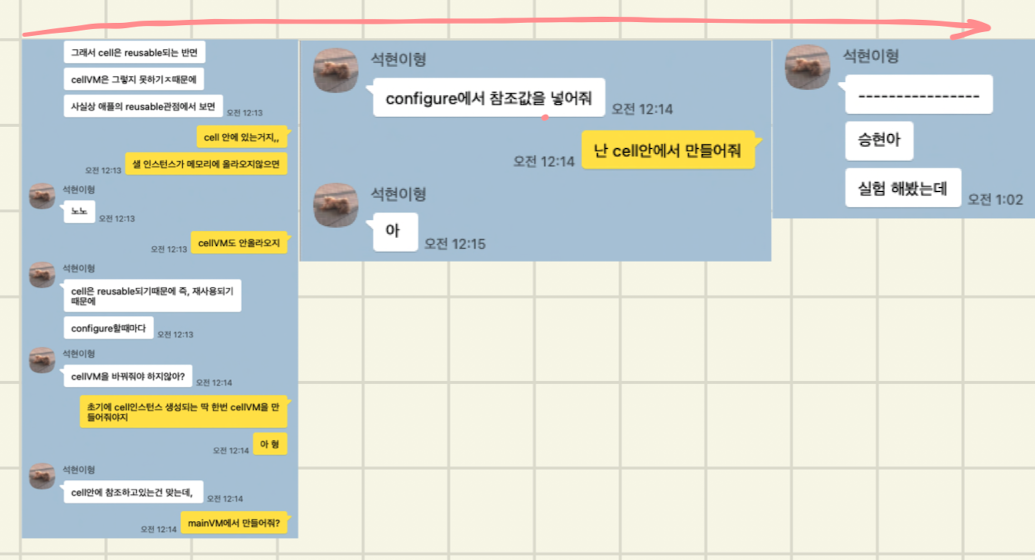 주요 내용은 오늘 다뤄볼 내용인 dequeueReusableCell의 재사용 메커니즘은 cell을 어떻게 관리하는지부터 시작되었습니다. 이로부터 시작되서 ~ 라인의 MessageViewModel은 왜 protocol이 아닌 class를 선택했는지에 대한 이야기까지.. 약 6시간의 대화를 했다는 ㅋㅋ,, 오늘 참 많이 배웠네요. (형 땡큐) 막연하게 재사용 큐에 의해 재사용 된다는 것은 알았는데 오늘 확실하게 알았습니다.