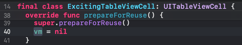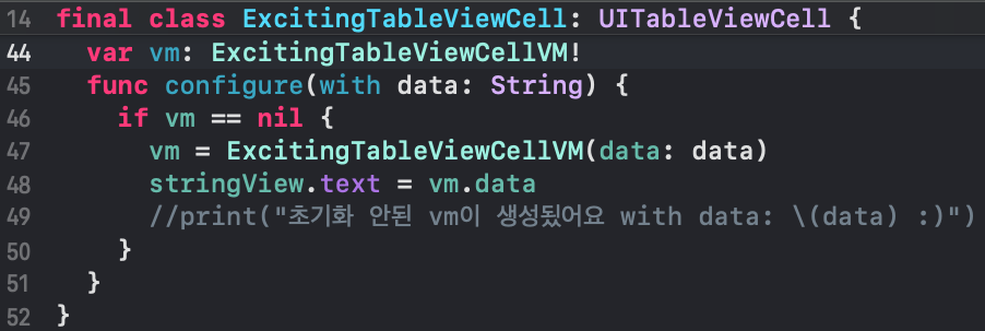 여기서 중요한 것은 cell.configure(with:)함수는 tableView(_:cellForRowAt:)에서 호출되고, 중요한 것은 cell 안에서 !!! vm의 인스턴스가 초기화 되지 않았다면 configure(with:)함수를 통해 초기화 해주는 것입니다.