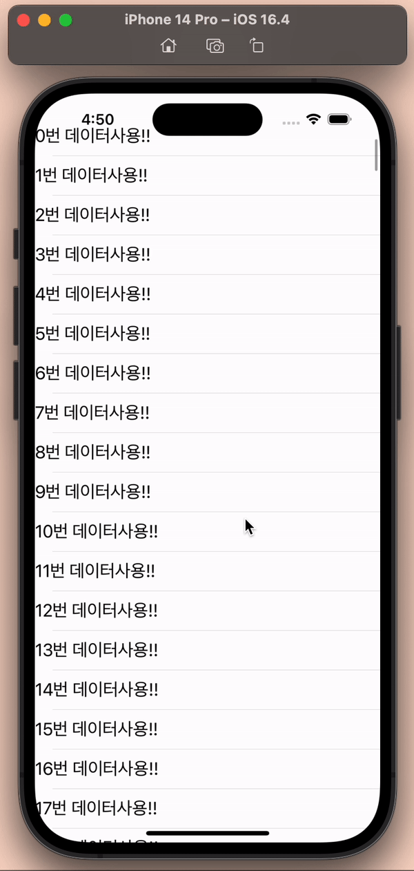 두 초기화 로직은 결국 아래로 스크롤 할 때(새로운 Cell이 화면에 보여질 때!!!!!!!!!) cell.configure(with:)를 호출해서 옵셔널 타입인 vm인스턴스를 초기화 해서!! vm이 직접 cell의 내부 UI component(여기서는 레이블)의 데이터를 갱신하는 것입니다.