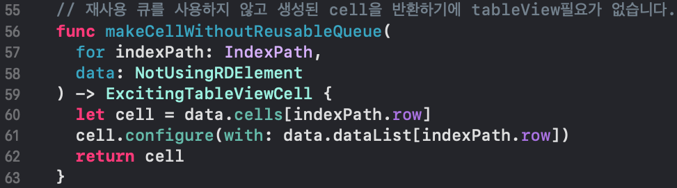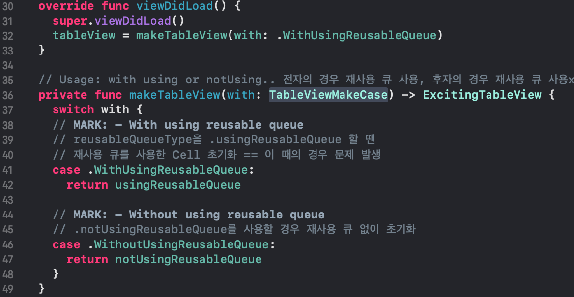 뷰 컨트롤러에서 viewDidLoad에서 makeTableView(with:)함수를 통해 재사용 큐를 사용할 경우, 재사용 큐를 사용하지 않을 경우 각각의 경우 실행할 수 있도록 코드를 구현했습니다.