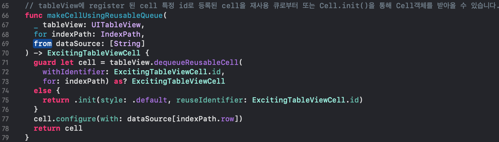 2. 내가 등록한 특정 cell이 재사용큐에 있다면 꺼내오고(using dequeueReusableCell(withIdentifier:for:)) , 재사용 큐에 dequeue된 cell이 없다면??!!(맨 처음에 빈 화면에 tableView의 영역만큼 cell이 채워져서 보여져야 하는 경우!!!) cell's init?(coder:) or init(frame:) 메서드를 통해 인스턴스를 생성해서 반환합니다.