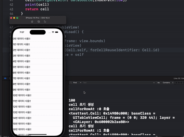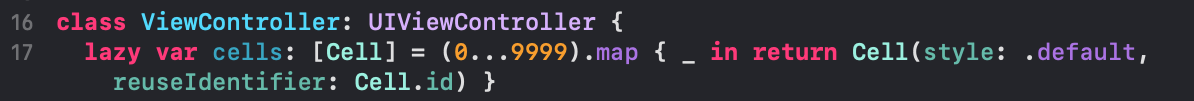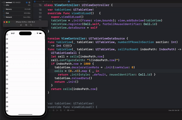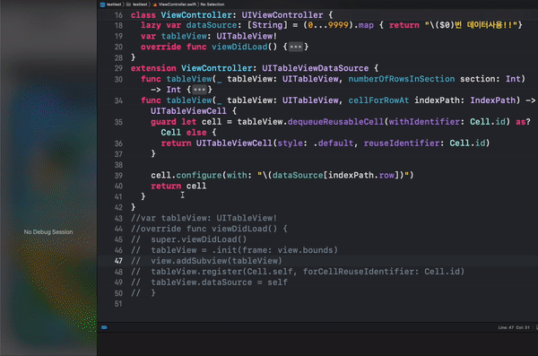 기본적으로 프로그램 실행 시 10000개의 Cell을 메모리에 로드했기에(10000개의 cell 인스턴스 바로 생성) 왼쪽 메뉴바의 Memory 사용량이 대략 100MB을 유지하다가 cellForRowAt의 indexPath.row > 1000일 때!!!!! 10000개의 인스턴스를 전부 메모리에서 해제한 후 3개만 추가했습니다. 메모리 사용량이 50MB로 뚝 감소했습니다. 장점은 Cell이 각각의 주소를 갖고 있다는 것? + 스크롤할 때 좀 더 빠르다는 것?! 단점은 인스턴스 10000개를 갖고 있기에 메모리 기본 사용량이 높습니다. (10000개의 인스턴스는 메모리에 로드되었기에 그만큼 자원을 사용하고 있기 때문입니다.)