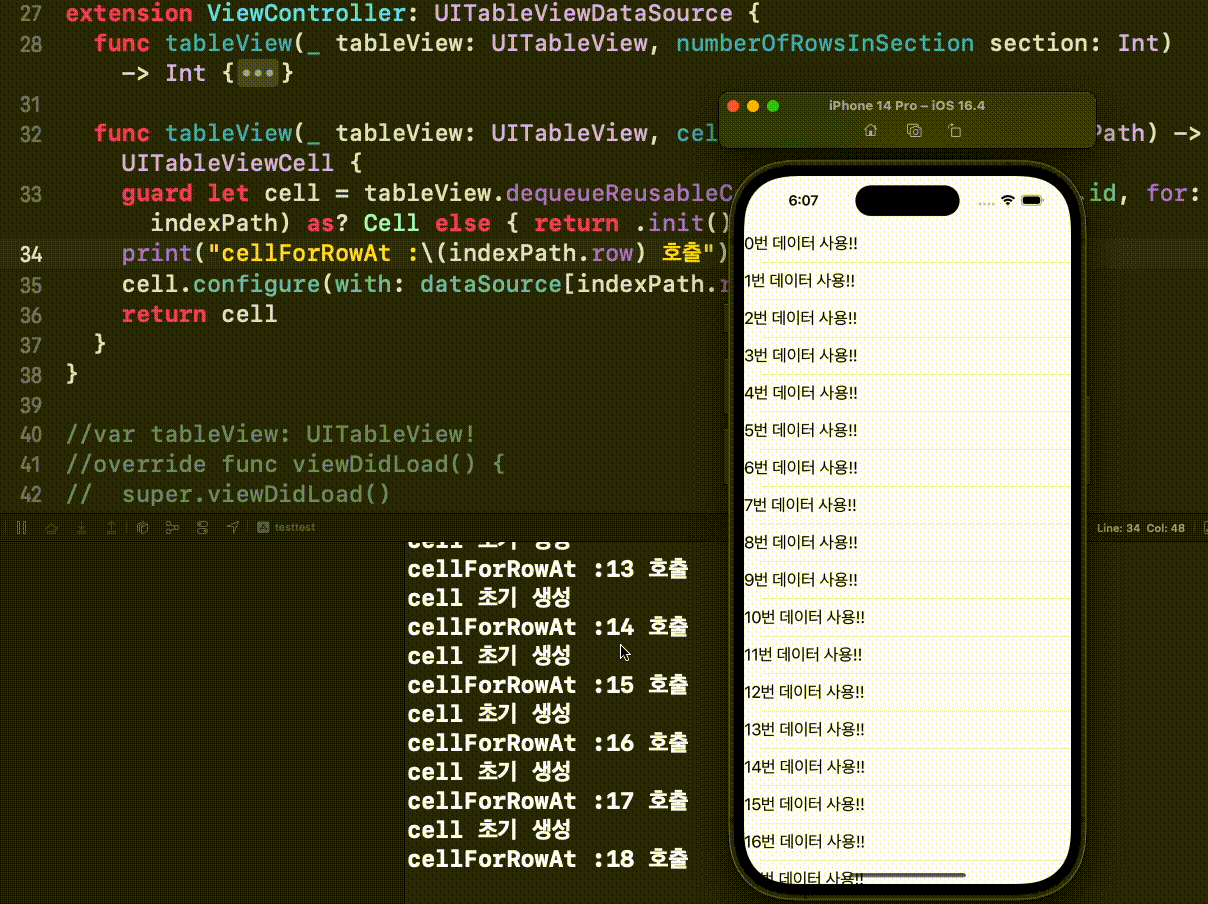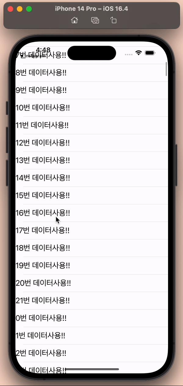 위 영상처럼 동작합니다. numberOfRowsInSection은 100을 반환합니다. 초기 화면에 보이는 Cell은 17개입니다. 17개만큼의 cell instance가 cell's init함수(지정 생성자)를 통해 호출됩니다. 그 이후 스크롤이 되어 화면에 사라질 cell은 인스턴스 할당 해제가 되지 않고, reusable Queue에 enqueue(삽입) 됩니다( cell 인스턴스 유지). 그리고 새로 보여져야 할 데이터는 cell의 인스턴스가 필요한데 이는 재사용 큐에 저장되었던 cell이 dequeue(반환) 해서 재사용합니다.