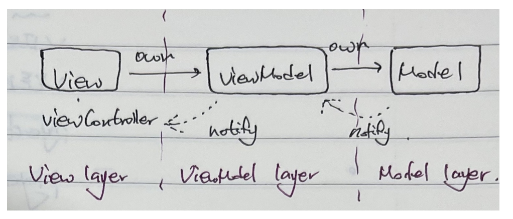 그리고 위 코드에서 Model이 ViewModel에게 notify하는 것은! 단순 값을 저장하는 모델이 하는게 아니라,, network, service, usecas등의 모델을 사용해서 서버에서 response된 (DTO)데이터들은 ViewModel에서 completionHandler로 받는다면? 이 부분은 "Model이 ViewModel한테 notify한다"라고 표현할 수 있다는 생각이 들었습니다. 사실 notify도 아니고 그냥 비동기적으로 서버에서 불러와진 completion handler 호출해주는 정도?! 이러면 위 그림에서 notify가 해결될 수 있겠다는 생각이 들었습니다.