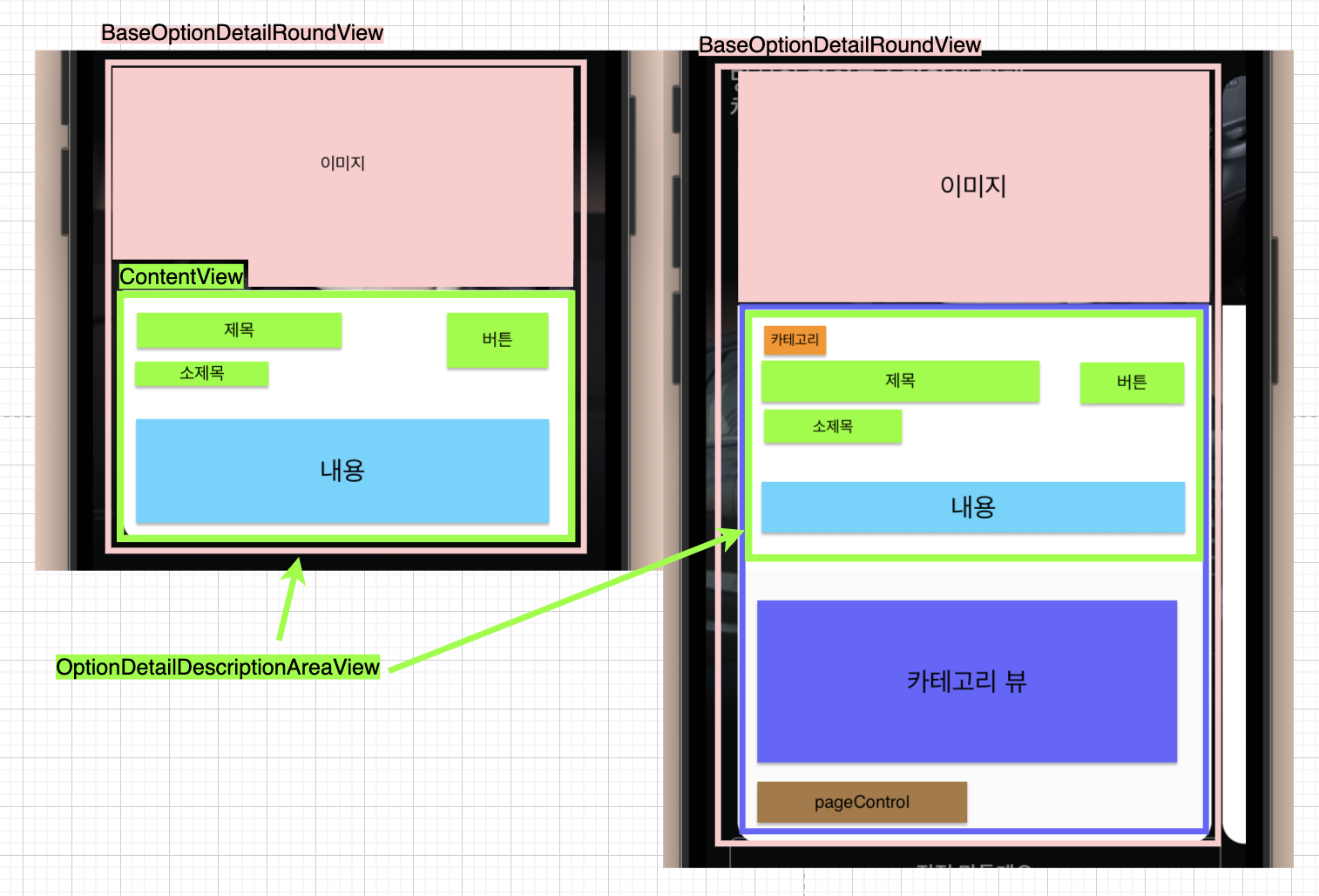 여기서 중복되는 코드는 이미지뷰, 컨텐트뷰이고 상황에 따라서 컨텐트 뷰 아래에 카테고리 뷰가 부가적으로 추가되는 경우가 있었습니다. 이때 더 최소한으로 설계하자면, BaseOptionDetailRoundView라는 큰 뷰 안에 같은 영역의 배치는 이미지 뷰와 ContentView(그림 1에서 왼쪽의 경우 초록 영역, 오른쪽의 경우 남색 영역)입니다. 그래서 이 두 개는 BaseOptionDetailRoundView 안에 auto layout으로 배치했습니다.