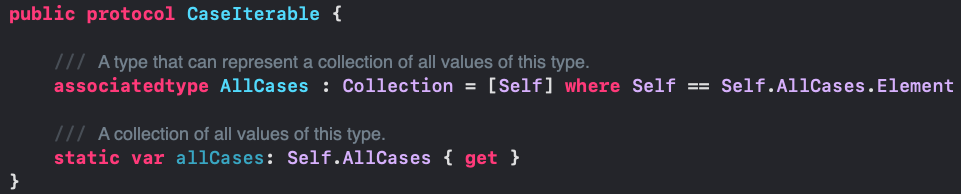 CaseIterable은 enum에서 정의한 enum type's 모든 cases를 allCases 프로퍼티를 통해 반환합니다.