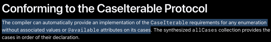 그 이외의 경우는 enum case's assocaited value, 특정 case를 @available 어노테이션으로 제약하지 않은 경우엔 컴파일러가 자동으로 enum's cases에 대해서 allCases를 제공해줍니다.