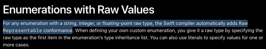 Enum에 String등의 rawType을 지정할 경우 컴파일러는 RawRepresentable protocol을 자동으로 준수합니다.