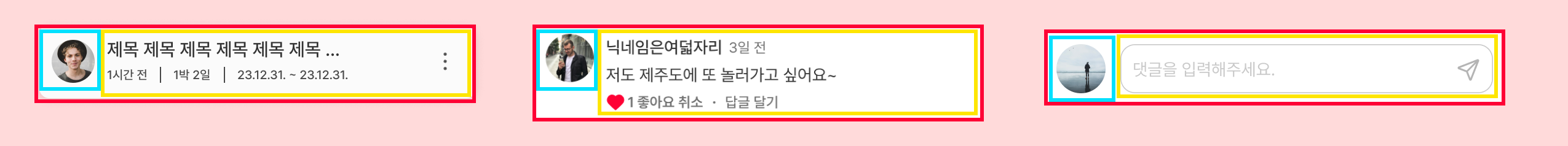 한번 더 표시를 했습니다. 빨간색 영역 안 둥근 프로필 입니다. 여기서 프로필의 크기는 25*25, 35*35 등 서로 다르지만, 공통적으로 프로필은 왼쪽에 위치하고 사용자가 프로필을 누를 경우 특정 사용자의 프로필 화면으로 이동해야 합니다.