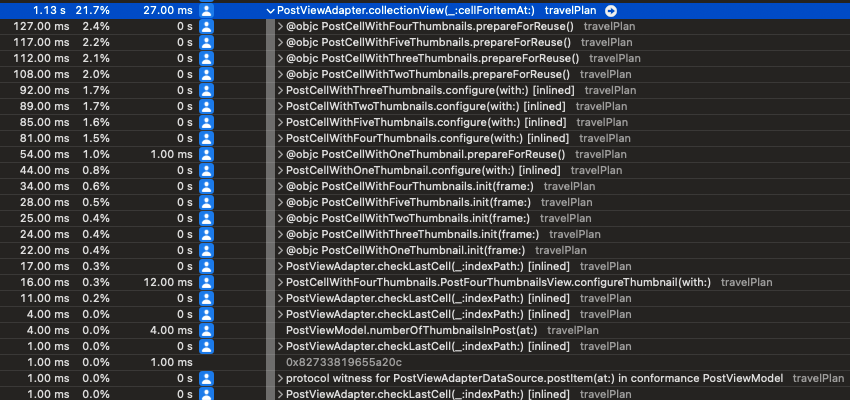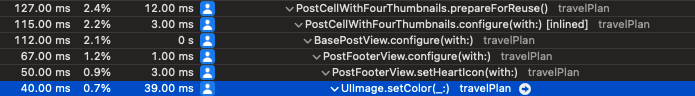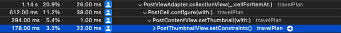 그래서 컬랙션 뷰와 뷰모델의 데이터를 주입하는 PostViewAdapter에서 컬랙션 뷰의 cellForItemAt 델리게이트 함수 중 post configure에서 많은 비용을 소모하고, 이때 configure(with:)함수에서 레이아웃 배치에 시간을 들인것 같습니다.