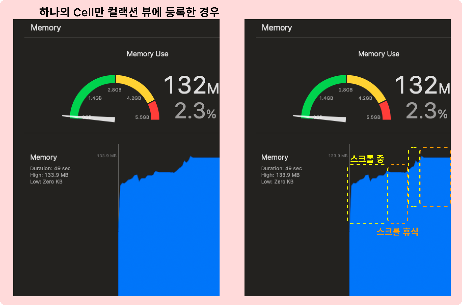 오+_+.. 여러개의 cell을 등록한 경우 스크롤을 빨리하다 멈추자마자(스크롤 감속 0이) 메모리 사용량이 20mb가량 떨어지고 스크롤을 빨리해도 유지가 됩니다. 신기하네요.