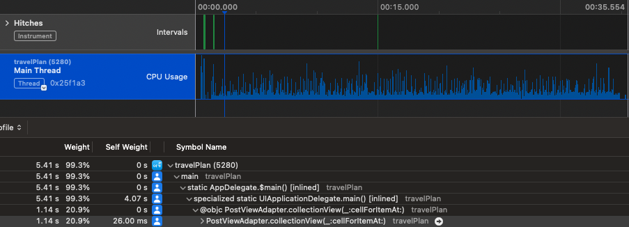 PostCell 한 개만 컬랙션뷰에 등록한 경우 메인 스레드 분석..