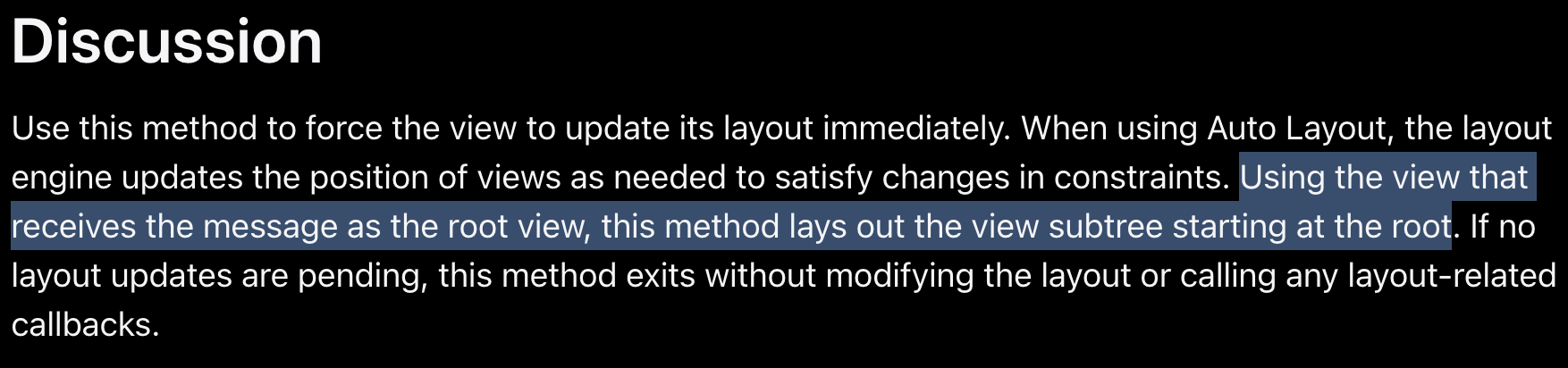 layoutIfNeeded는 이를 호출해서 receive로 사용한 뷰를 rootView로 합니다. 그리고 이 뷰에서 서브 트리에 따라 뷰들을 lay out합니다. rootView의 constraints에 의해 오토레이아웃 앤진이 계산한 크기등을 기반으로 자식들의 크기, 위치를 정합니다.