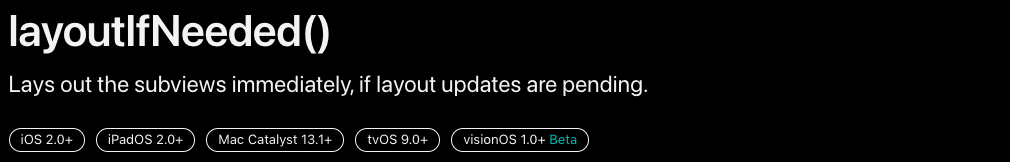 그래서 layoutIfNeeded()를 호출하는 것은 정말 중요합니다. 그러나 이를 호출하는 뷰를 기준으로 자식뷰들의 layoutSubviews를 호출할 가능성이 있기에 부하가 큰 메서드입니다. 만약 layoutIfNeeded()를 호출했는데 Update cycle에서 호출할 layout이 없다면? 레이아웃 관련 컬백 메서드를 호출하지 않습니다. 헉,,,, 그래서 정말로 layout if needed 인 것입니다.