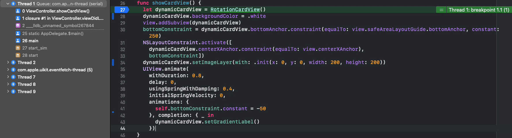 showCardView()가 호출될 때 dynamicCardView가 화면의 아래에 있다가 위로 올라오도록 하는 코드를 AutoLayout으로 위치를 정하고 애니메이션을 통해 아래서 위로 보여지는 동적인 화면을 구현했습니다. 위 코드는 실제 프로젝트의 showCardView() 내부 코드와 살짝 다릅니다. 프로젝트에서 showCardView() 함수 내부 구현된 코드를 주석 처리 후 이 코드를 붙여넣어주세요. 이를 기반으로 구현해나갈것입니다.