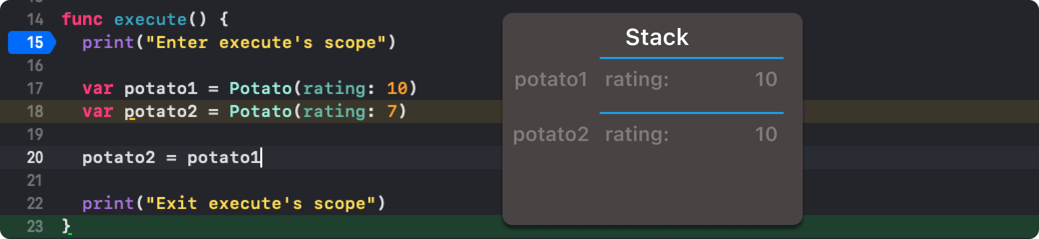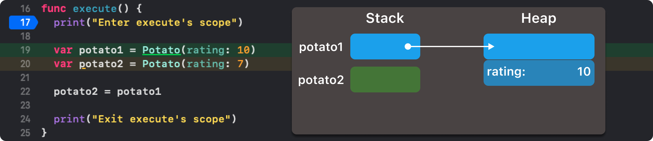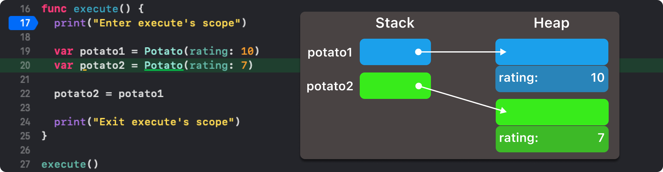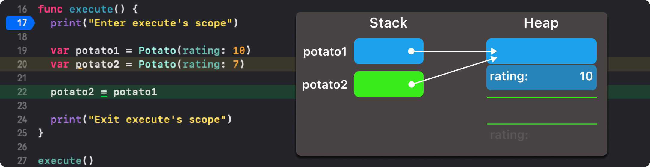 class(reference)와 struct(value) 차이는 특정한 인스턴스를 다른 인스턴스에 치환할때! 두드러지게 차이가 발생하게 됩니다. 22라인의 코드를 실행한 후에 기존에 heap 영역에 할당되었던 potato2가 참조하던 인스턴스는 메모리에서 할당 해제가 됩니다. 그리고 potato1, potato2 두 인스턴스는 힙 영역의 한 인스턴스 메모리 주소를 같이 참조하게 됩니다. 그래서 potato1을 통해 rating을 변경해도 potato2도 변경이 되는 것입니다.