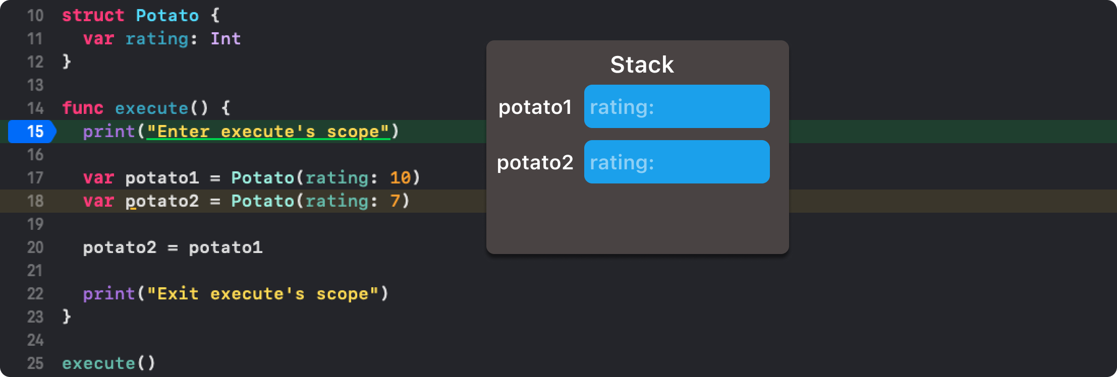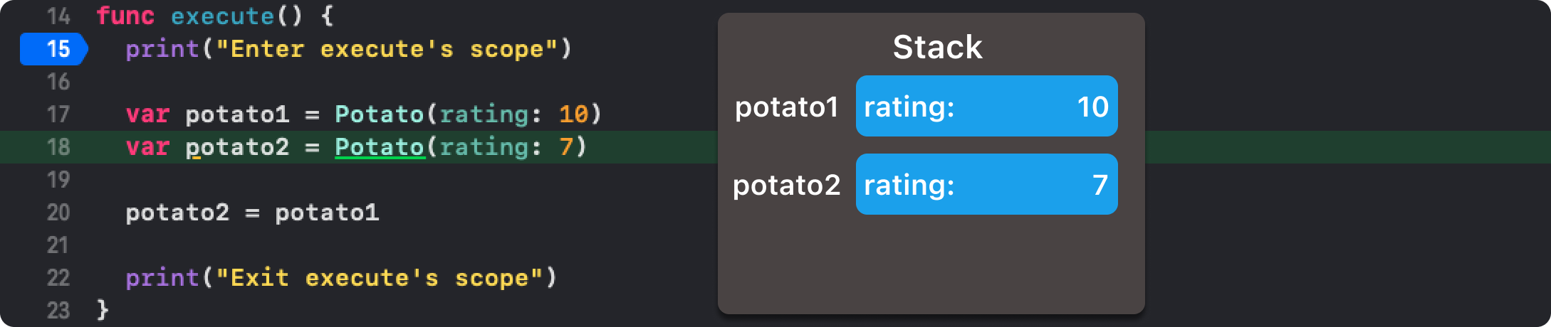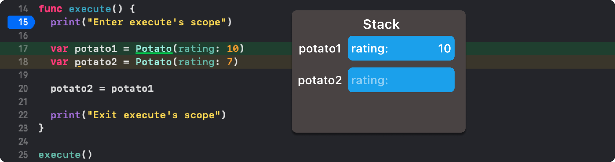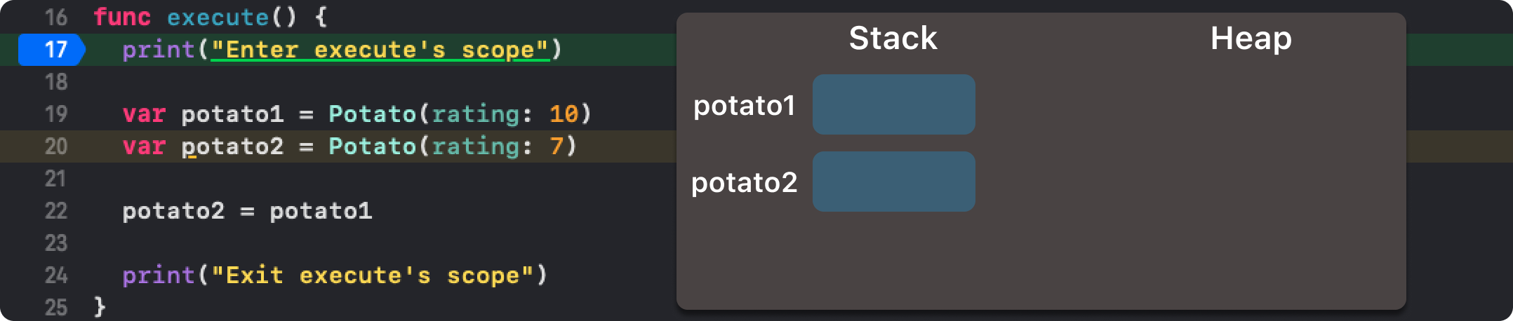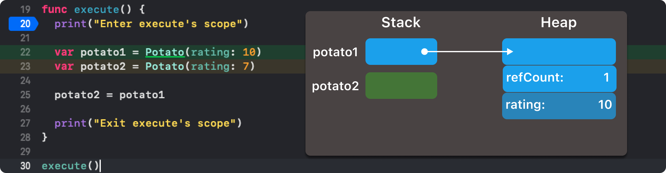 class(reference)와 struct(value) 차이는 특정한 인스턴스를 다른 인스턴스에 치환할때! 두드러지게 차이가 발생하게 됩니다. 22라인의 코드를 실행한 후에 기존에 heap 영역에 할당되었던 potato2가 참조하던 인스턴스는 메모리에서 할당 해제가 됩니다. 그리고 potato1, potato2 두 인스턴스는 힙 영역의 한 인스턴스 메모리 주소를 같이 참조하게 됩니다. 그래서 potato1을 통해 rating을 변경해도 potato2도 변경이 되는 것입니다.