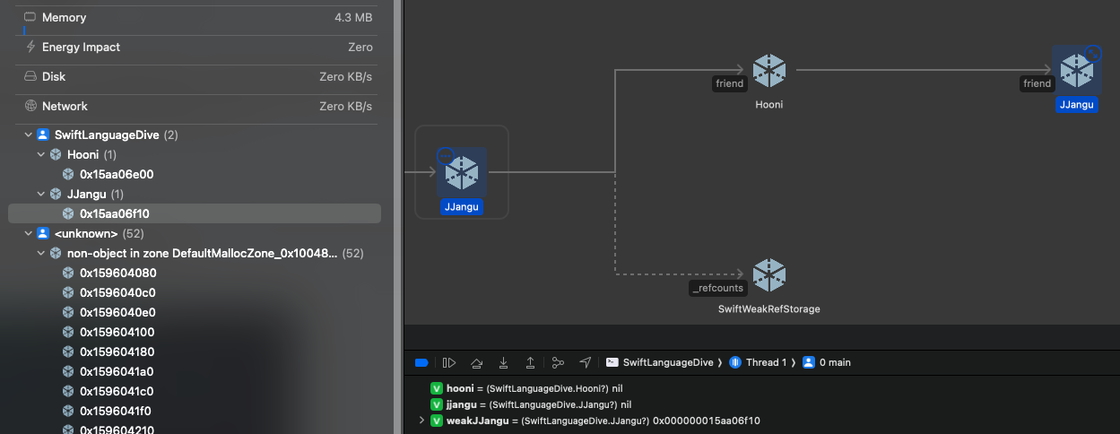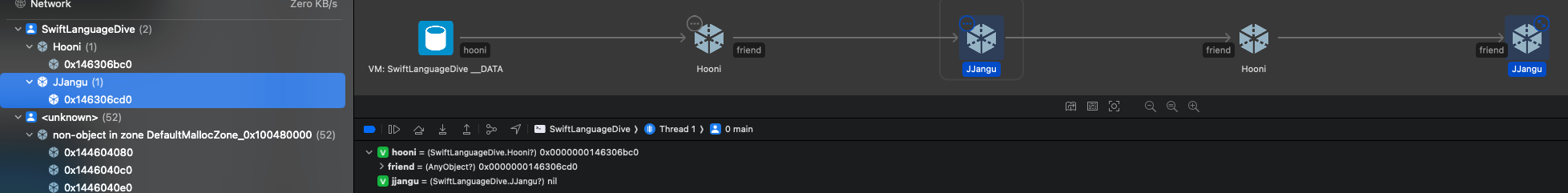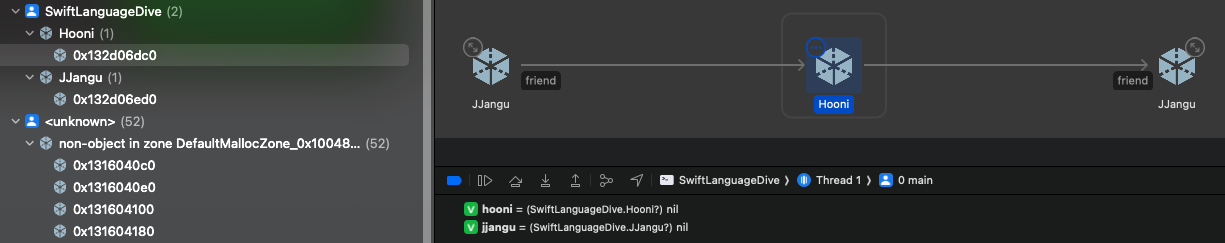 이렇게 짱구를 약하게 참조를 한 후에 jjangu, hooni의 인스턴스를 nil을 통해 해제했을때 직후의 시점을 memory graph를 보겠습니다.