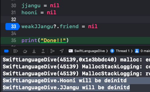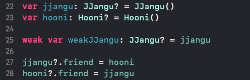 다시 예제2로 돌아와서 jjangu, hooni = nil이 되어도 여전히 힙 영역에 존재하는 것입니다. 그래서 두개의 deinit이 불리지 않습니다. 이걸 어떻게 확인할 수 있을까요? 몇 방법이 있지만 정말 간단하게 weak 하게 참조하는 것입니다.