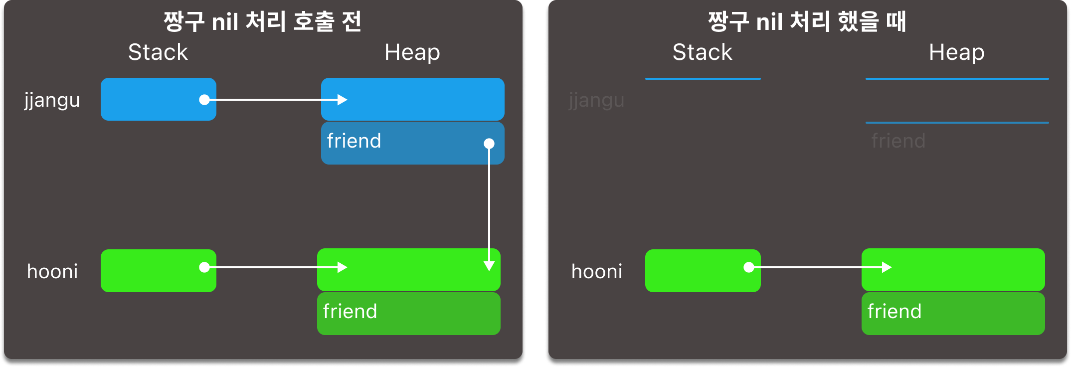 짱구의 인스턴스는 nil이 됩니다. 아직 후니는 전역변수로 남아있는데, 그 후니의 친구가 짱구를 강력하게 참조해서 hooni.firend를 통해서 여전히 짱구의 인스턴스에 접근할 수 있습니다. 그러나 stored property인 jjangu의 인스턴스는 nil이 됩니다. 그러나 hooni.friend를 통해 힙 영역에 할당된 jjangu 인스턴스는 여전히 힙 영역에 메모리를 점유하고 있습니다.