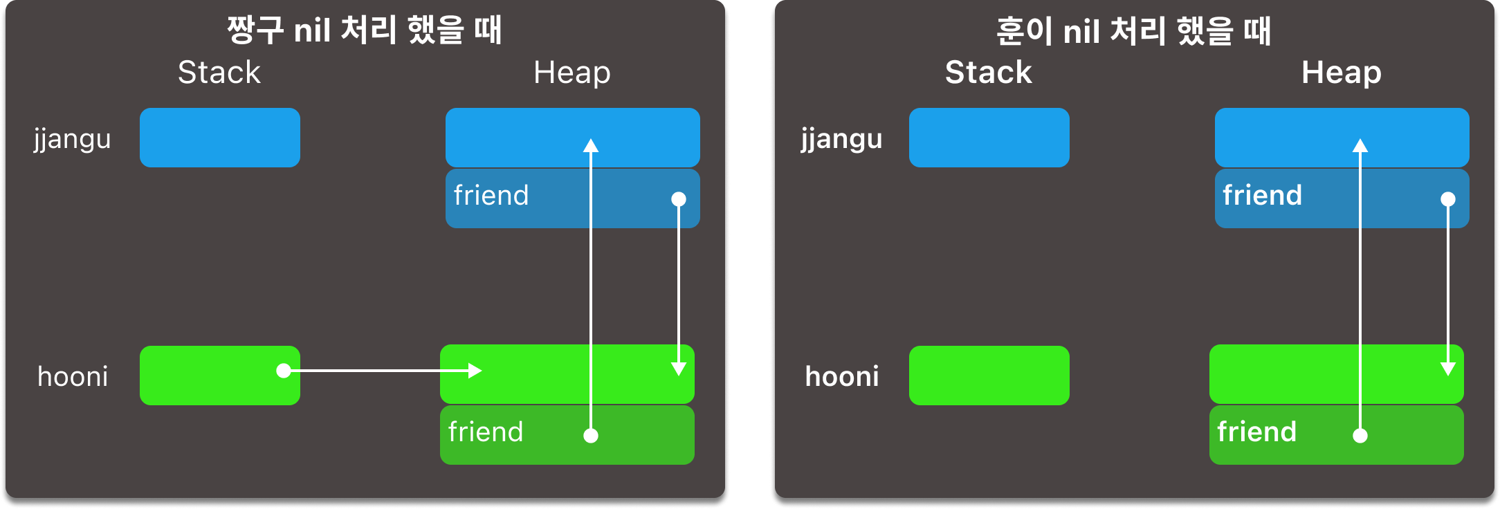 여전히 heap영역에서 두 인스턴스의 메모리는 할당되어있지만 hooni, jjangu의 인스턴스는 nil 입니다.