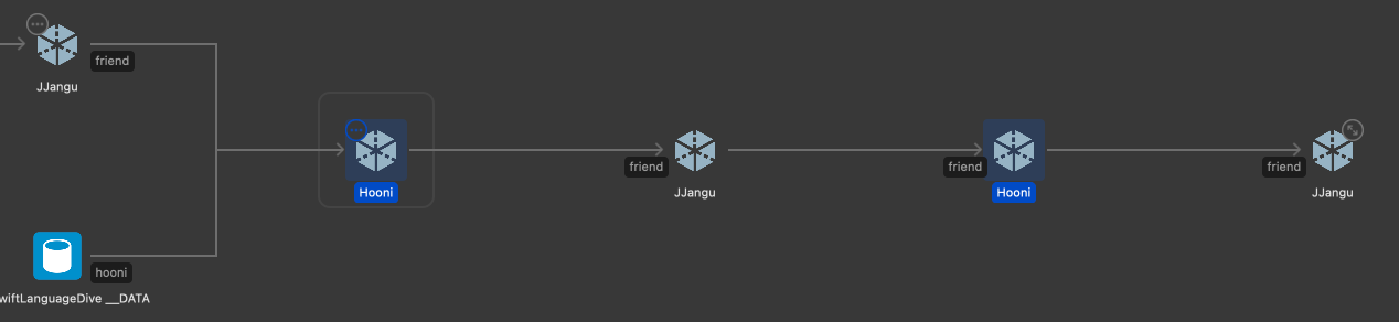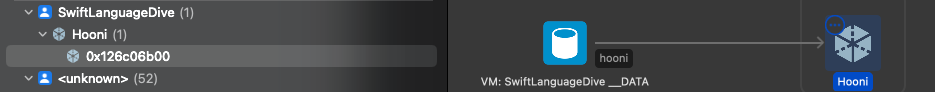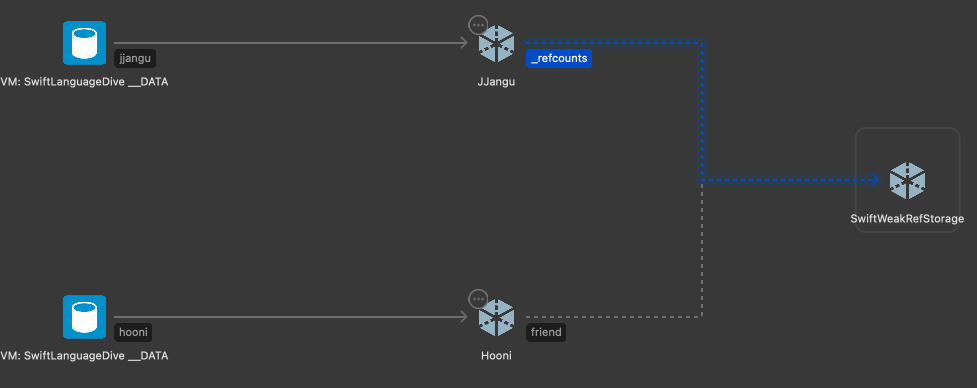 여기서 알 수 있는 것은 memroy의 __DATA segment가 짱구 인스턴스를 참조하고, 후니 인스턴스도 참조한다는 것입니다. 그리고 JJangu의 프로퍼티인 friend가 Hooni 인스턴스를 참조한다는 것입니다.