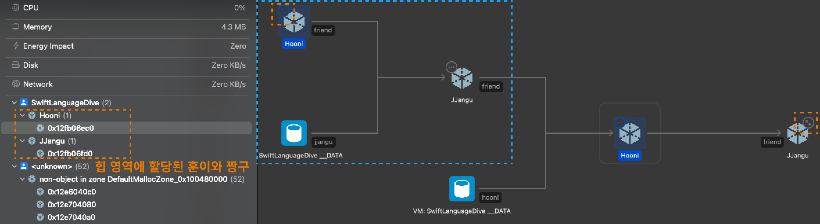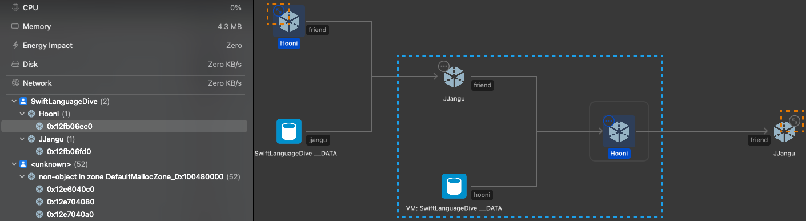 Hooni 인스턴스는 VM: __DATA에서 강력하게 참조중입니다. 그리고 JJangu의 friend 프로퍼티도 마찬가지로 후니를 강력 참조하고 있습니다. 그리고 후니, 짱구의 펼쳐보기 화살표를 누르면?