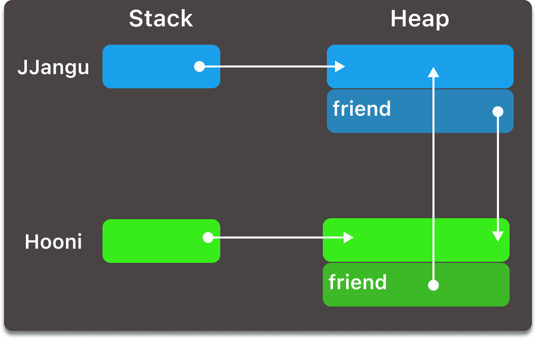JJangu의 friend나 Hooni의 friend 멤버 프로퍼티를 weak로 선언하거나 둘다하면 해결됩니다. weak는 reference count가 증가되지 않기 때문입니다.