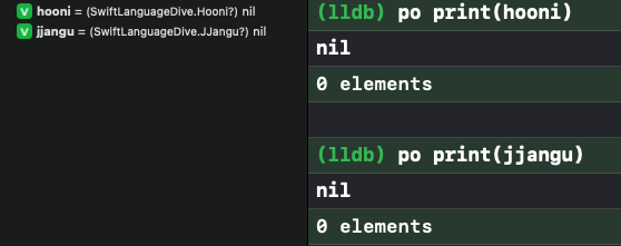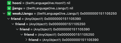 그렇게 위 scope를 벗어나도 영원히 JJangu, Hooni 인스턴스에서 deinit이 호출되지 않습니다. 서로가 강력 참조중이므로 여전히 힙 영역에 메모리를 점유하고 있기 때문입니다.